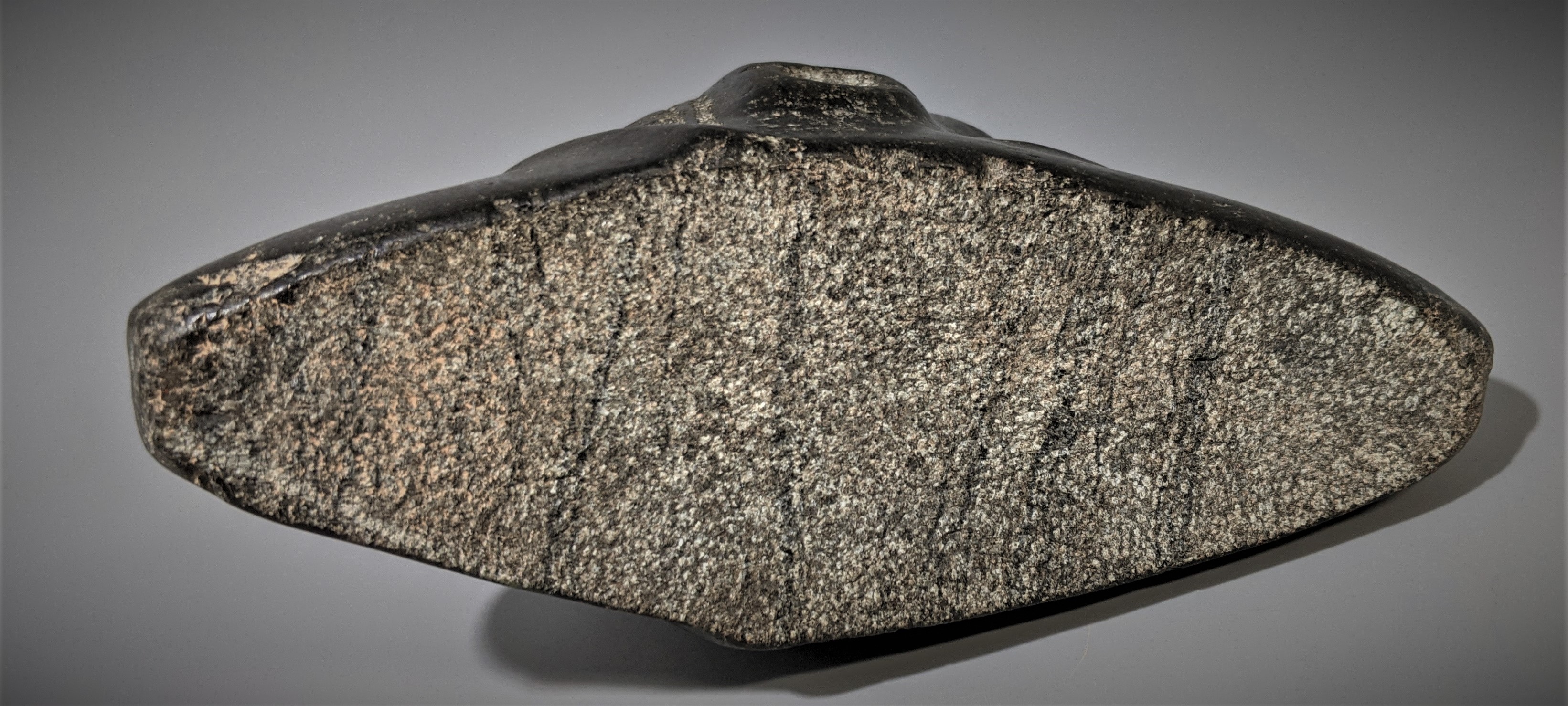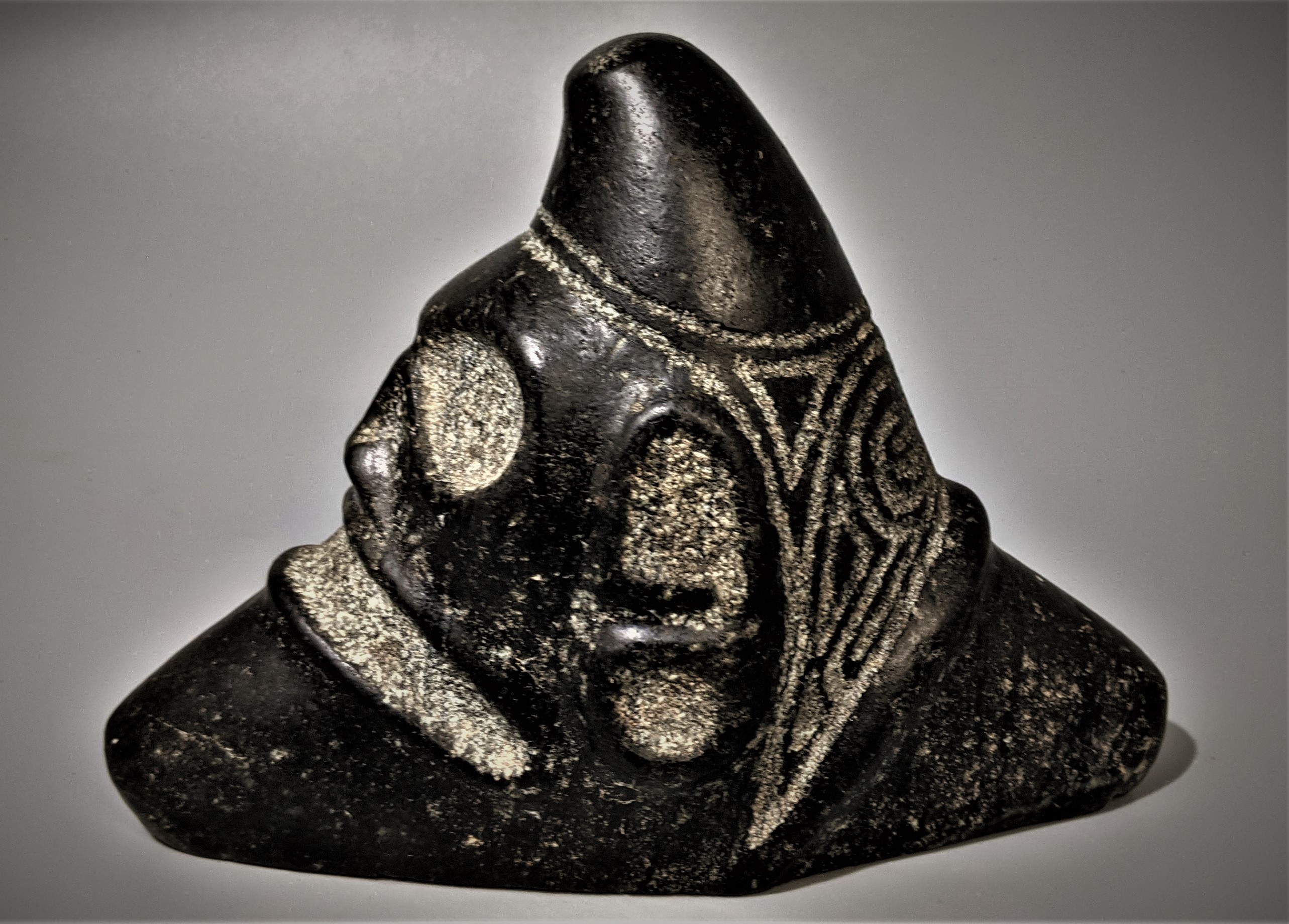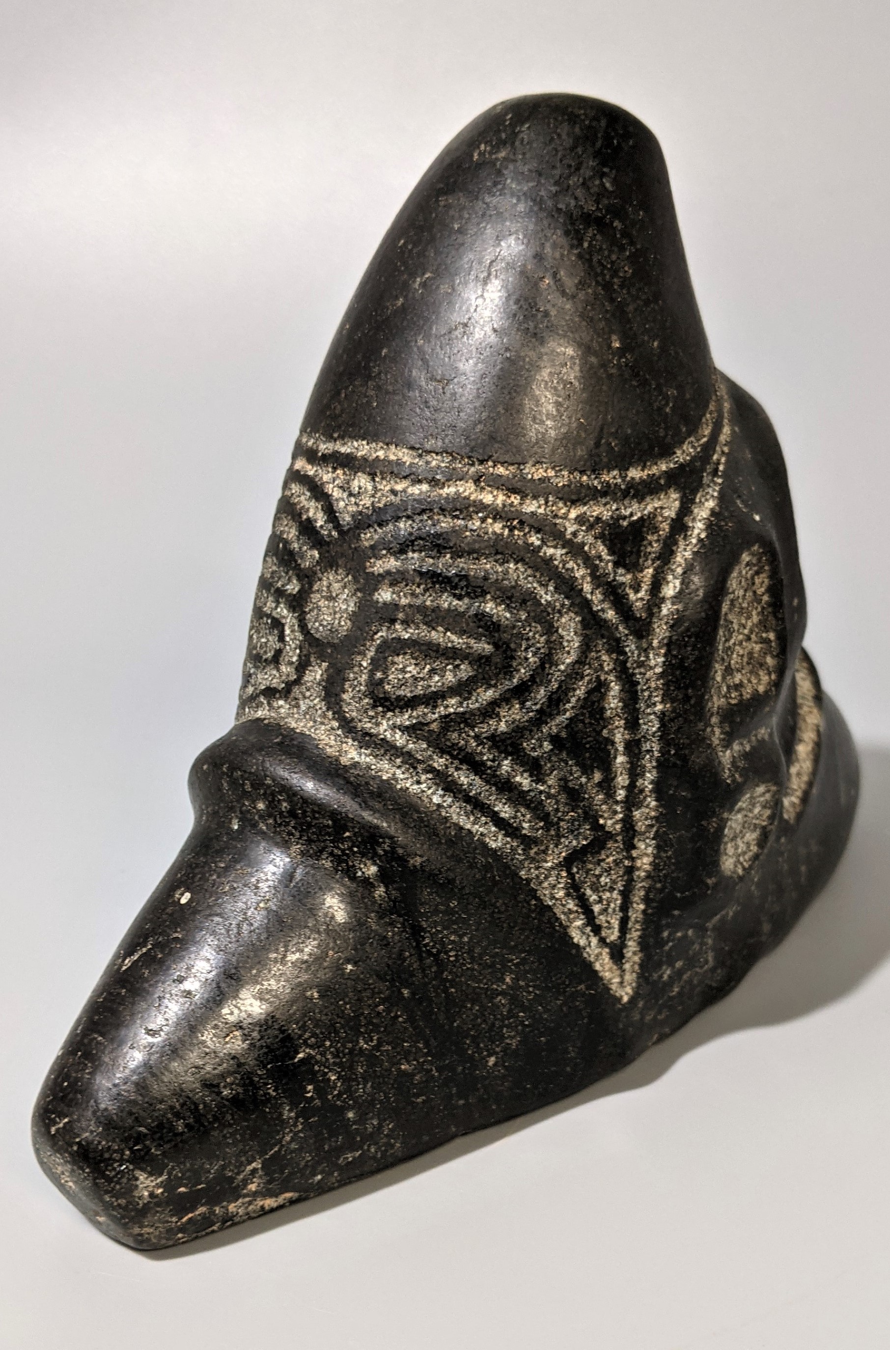 A medium large size, the black sea stone with polish surface. Pet carved features and voids. Nice condition with no modern polishing. 5 inches high and 7 inches across.