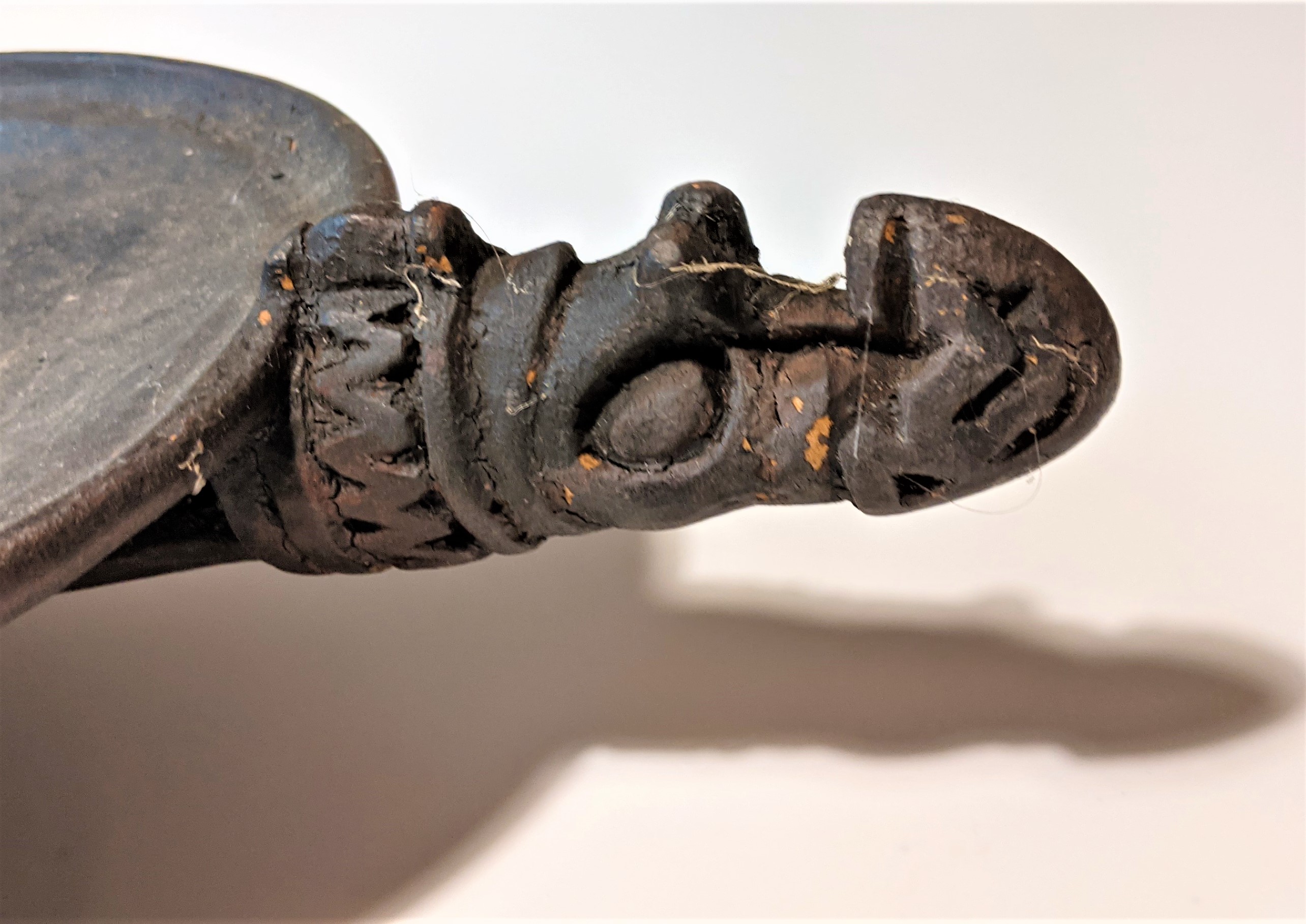 Antique 19th century, both ends carved with fierce zoomorphic humanoid heads. Dark natural surface patina very strong condition. Pacific islands. 30 inches long and 10 inches across.