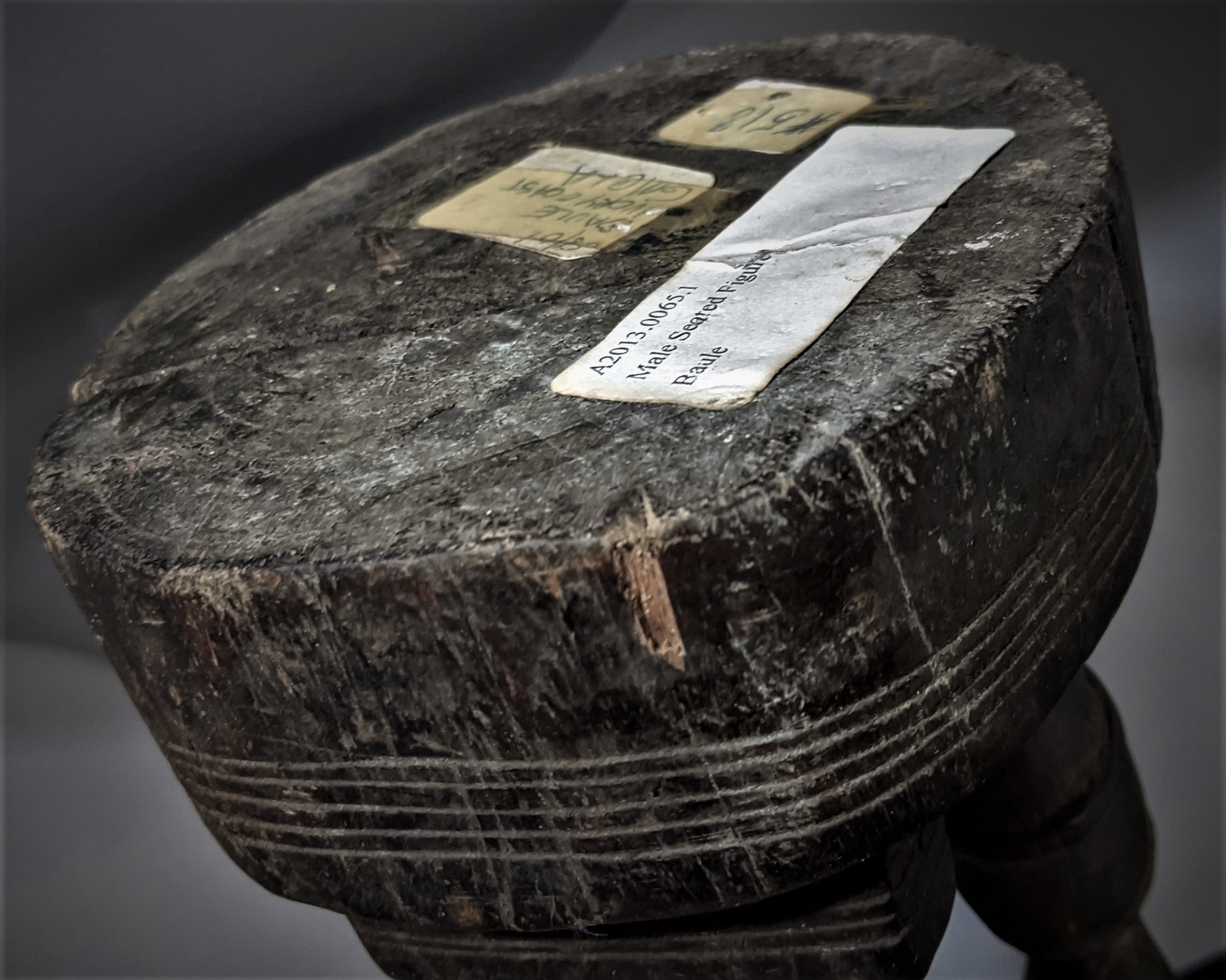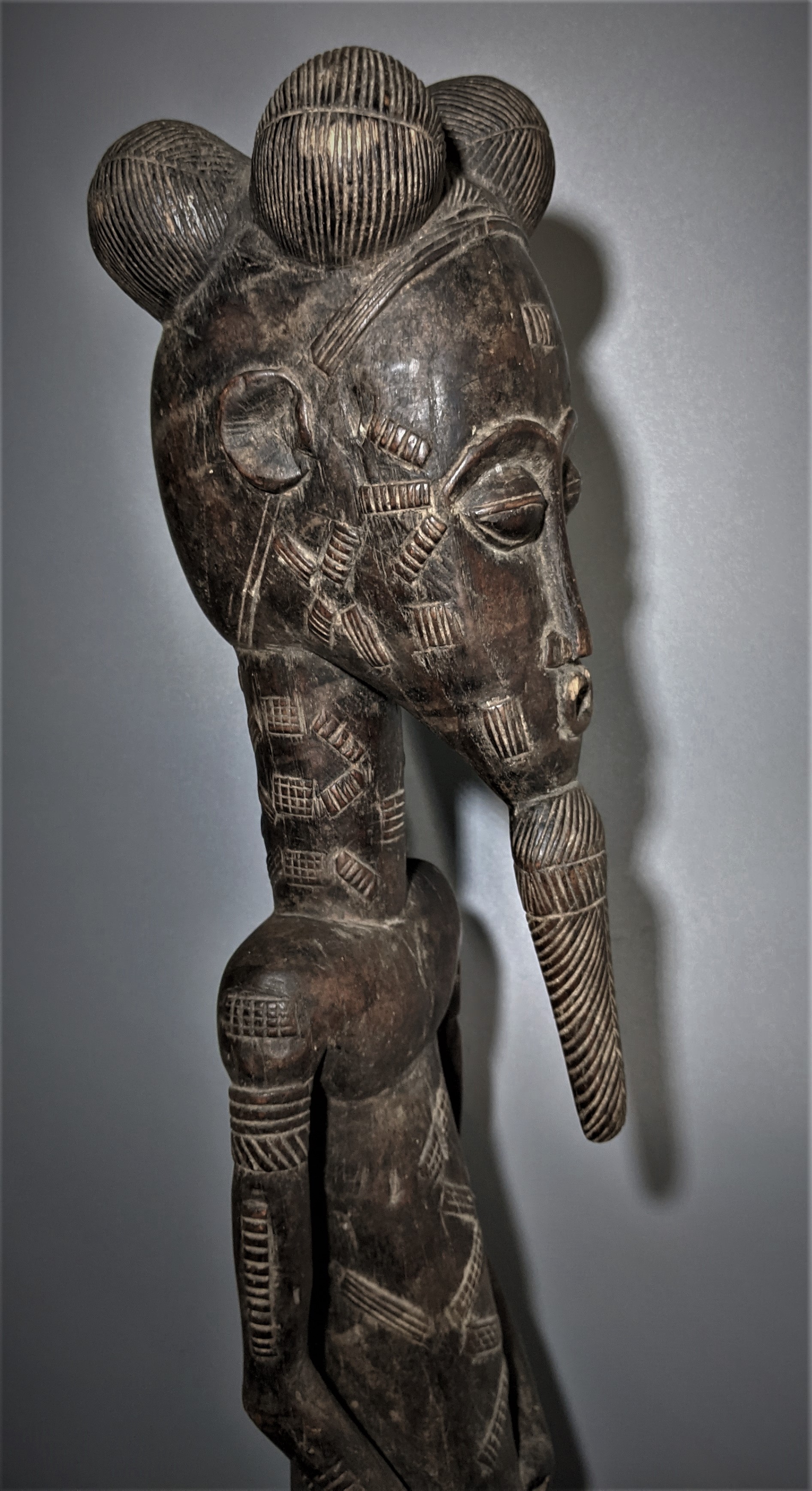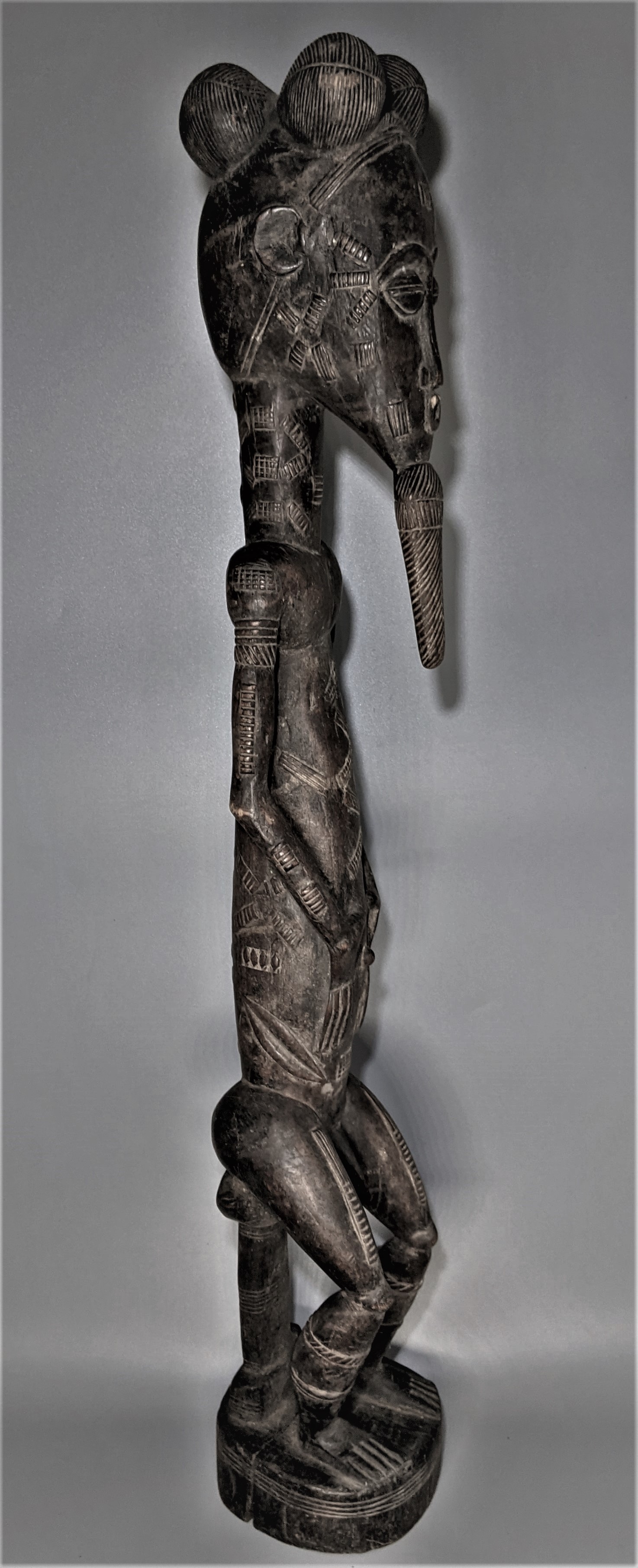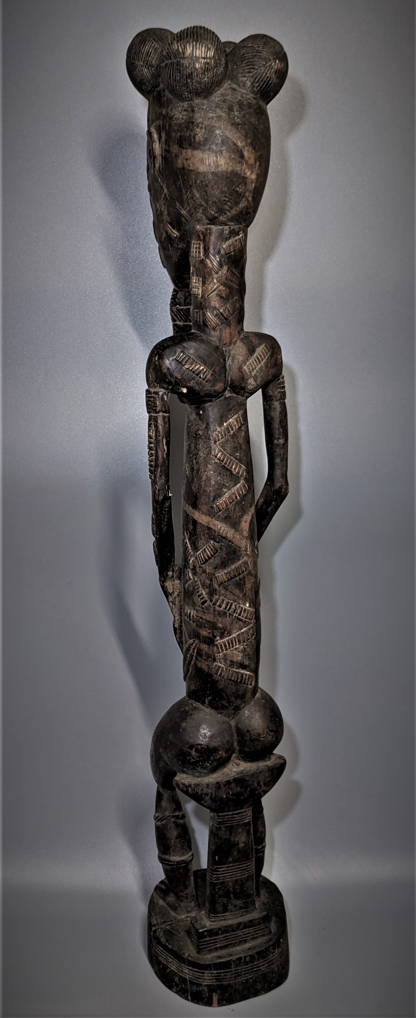 Particularly large of the type, an antique of strong age. This royal male, from the Ivory Coast is profusely carved with scarification. A coffure and beard denoting rankGender apparent, his elongated fingers clutch its belly. An ancient crack across its base. 32 inches tall. Ex Massachusetts museum.