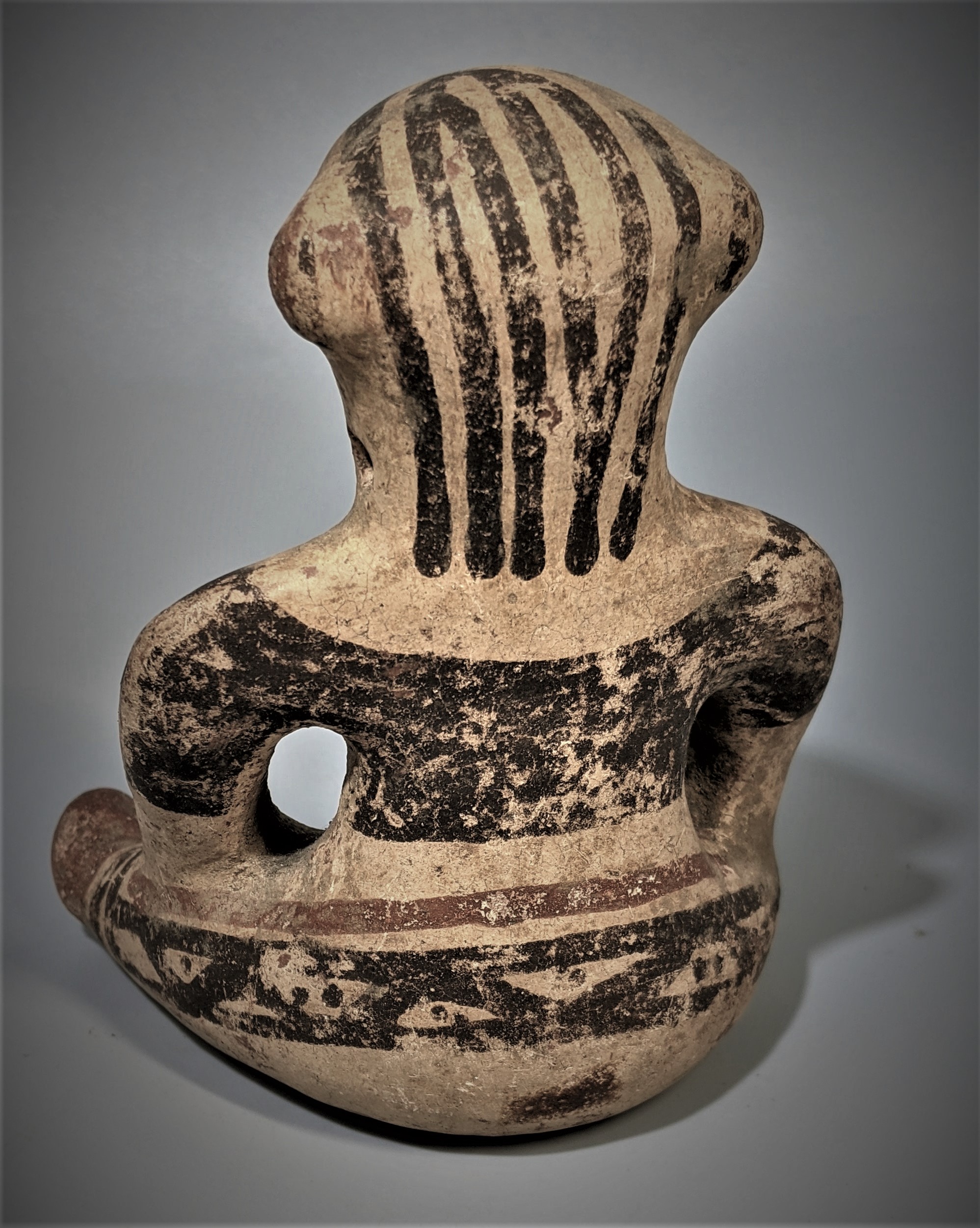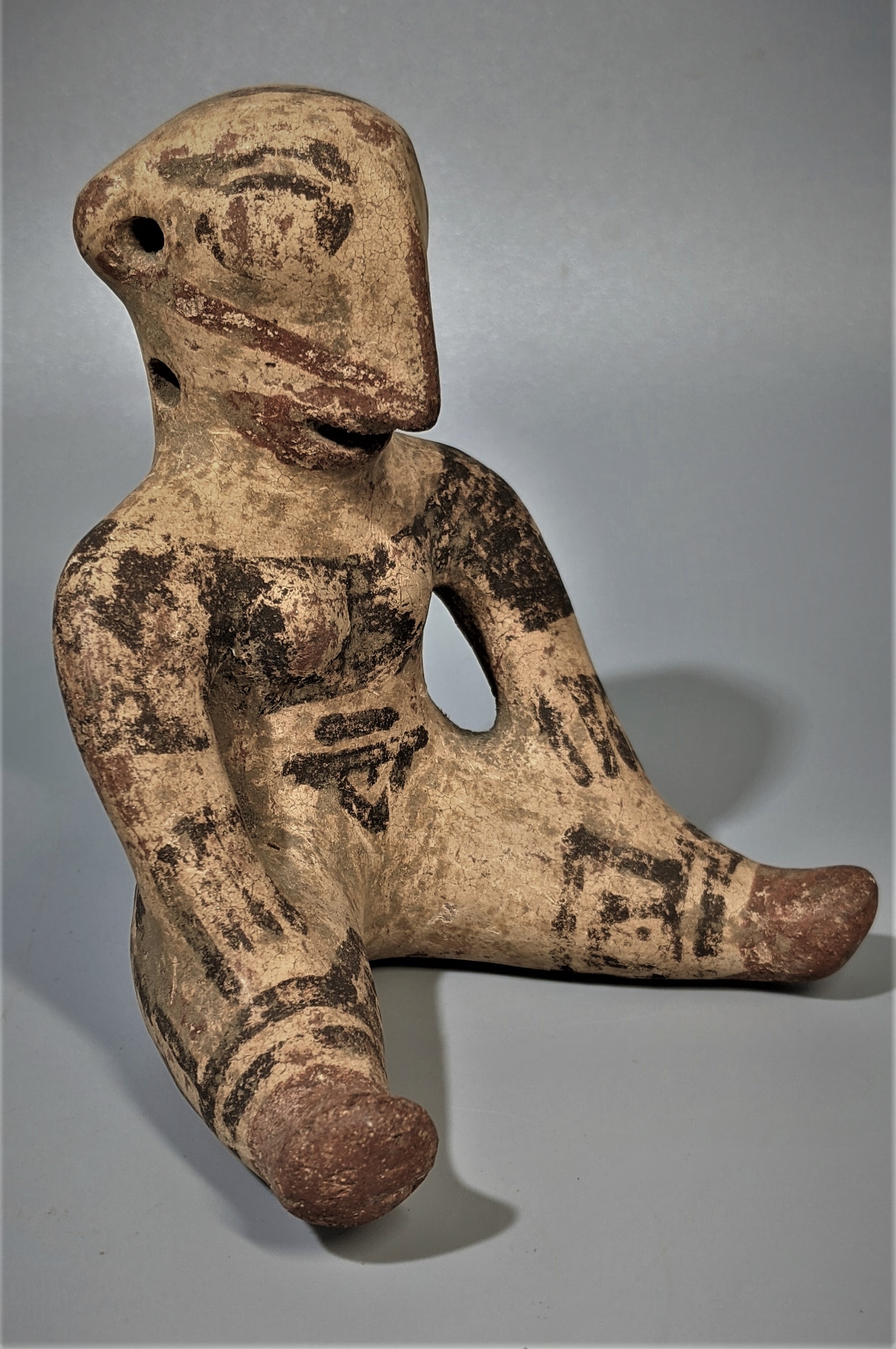 Mayan 500 to 800 AD. The painted and seated male had six musical holes. Nice original and all intact condition, including 90% of its red and brown earth tones over a cream slip. Excellent condition. 5 inches high and 4 across.