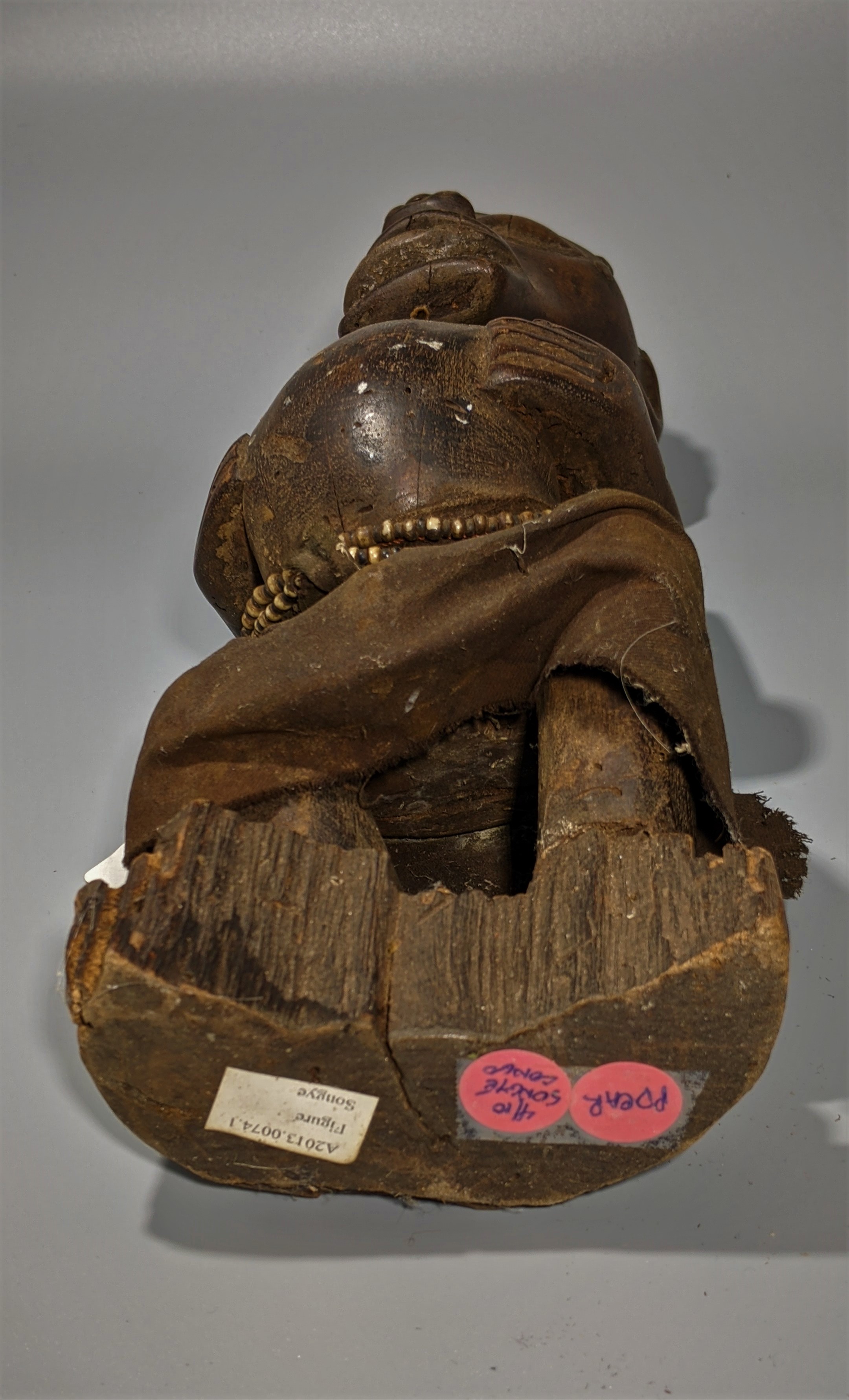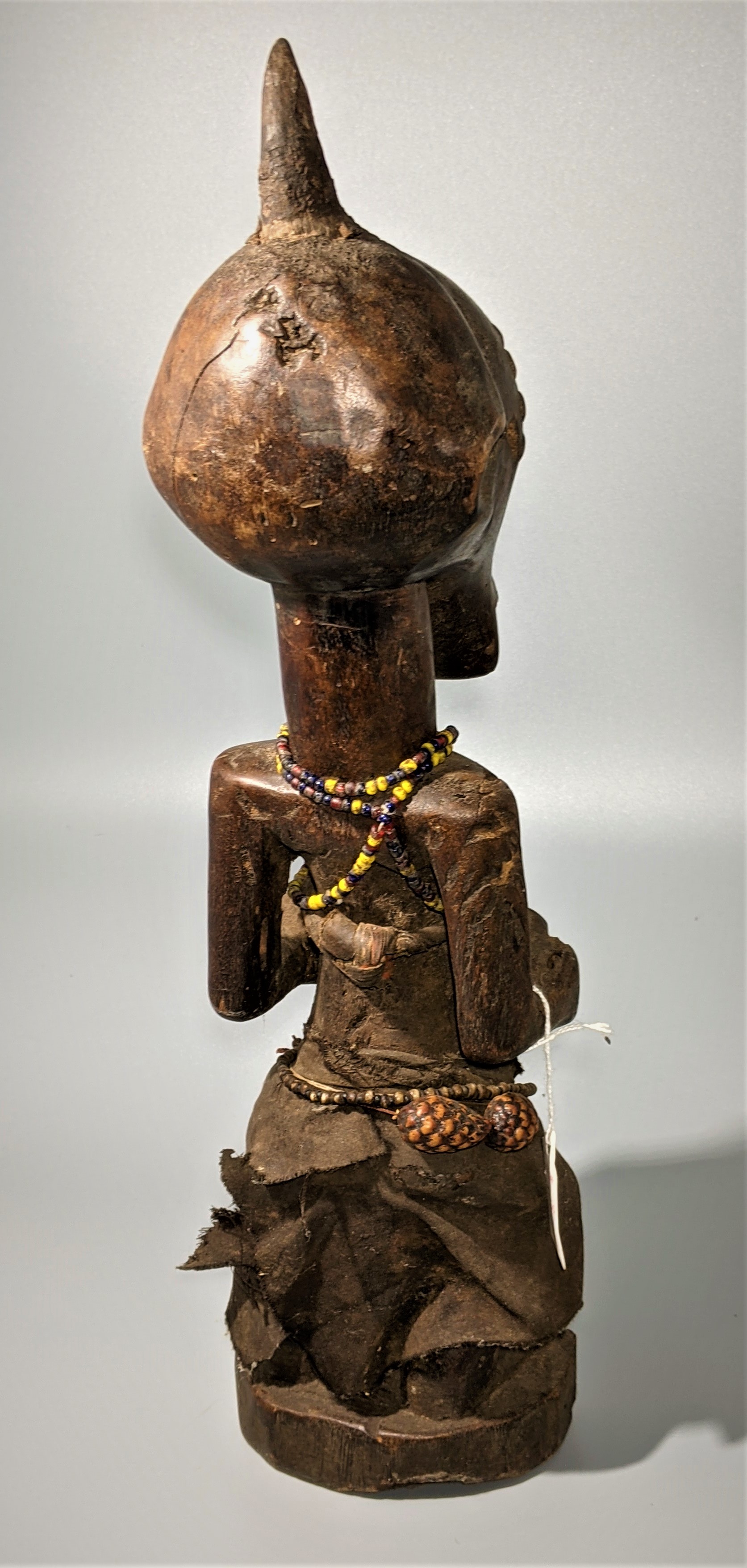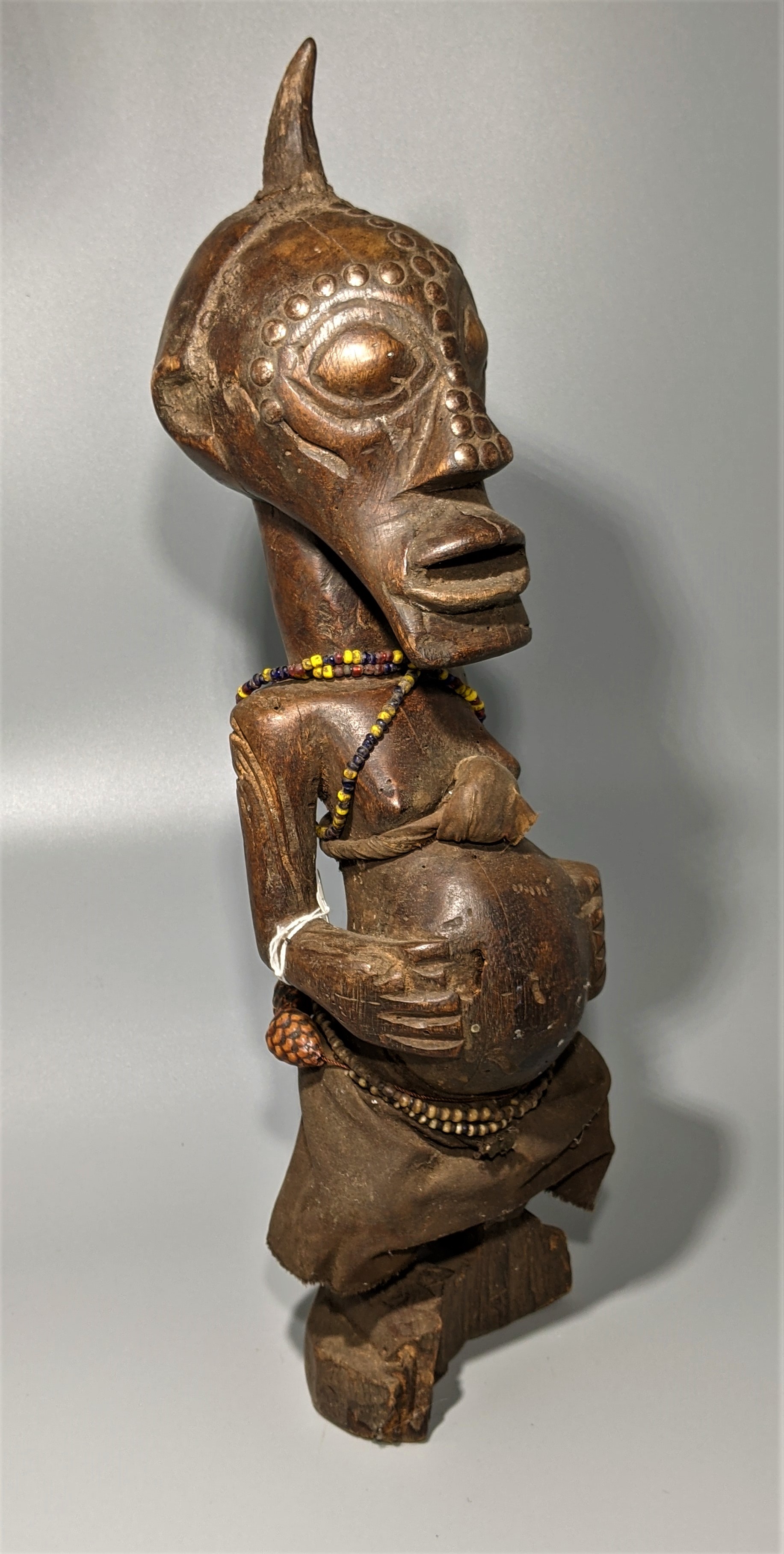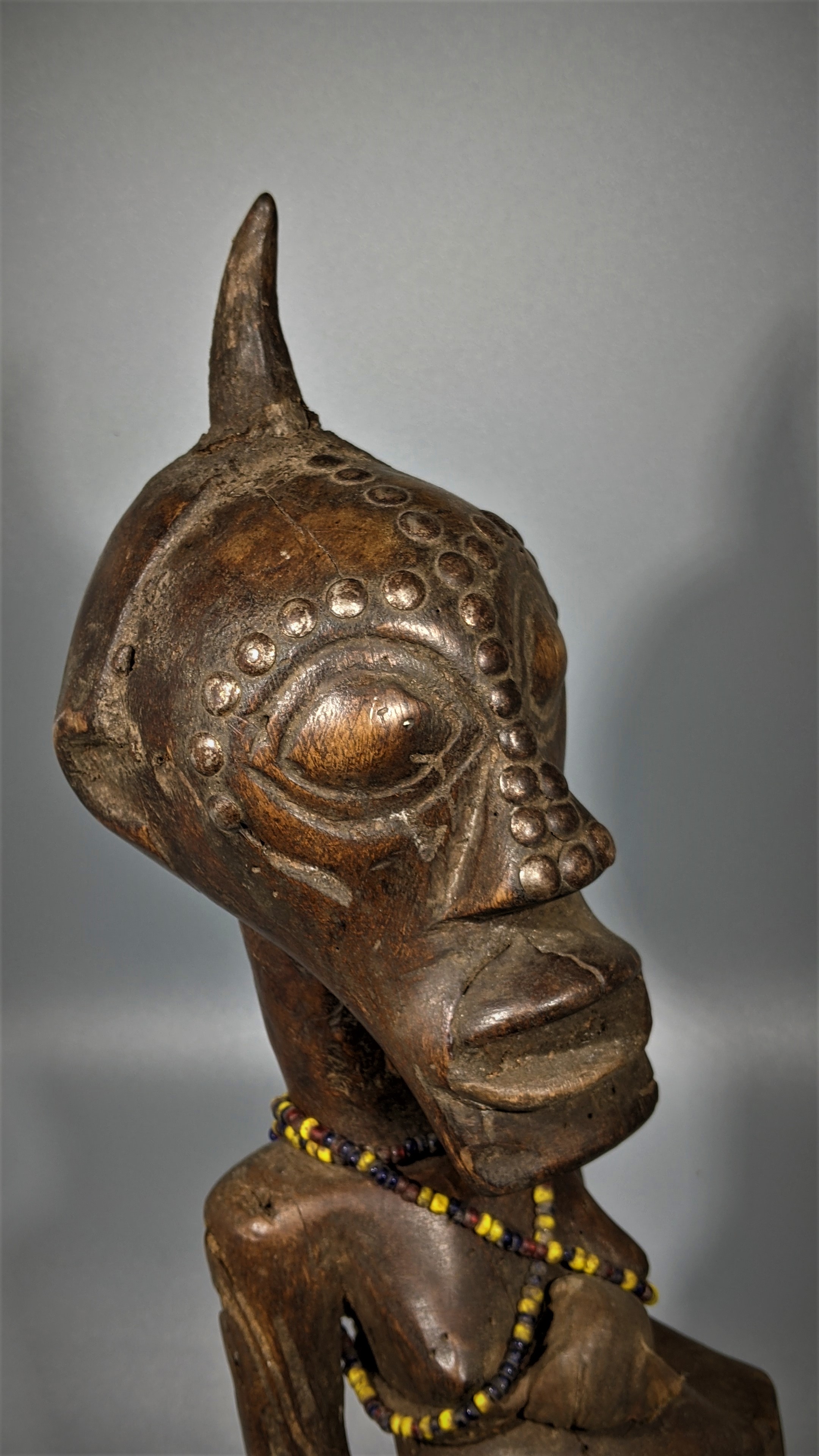Animal horn, bronze studs, bead work and magic pouch. Front half of the feet and base missing. Real age, Congo. 18" Height