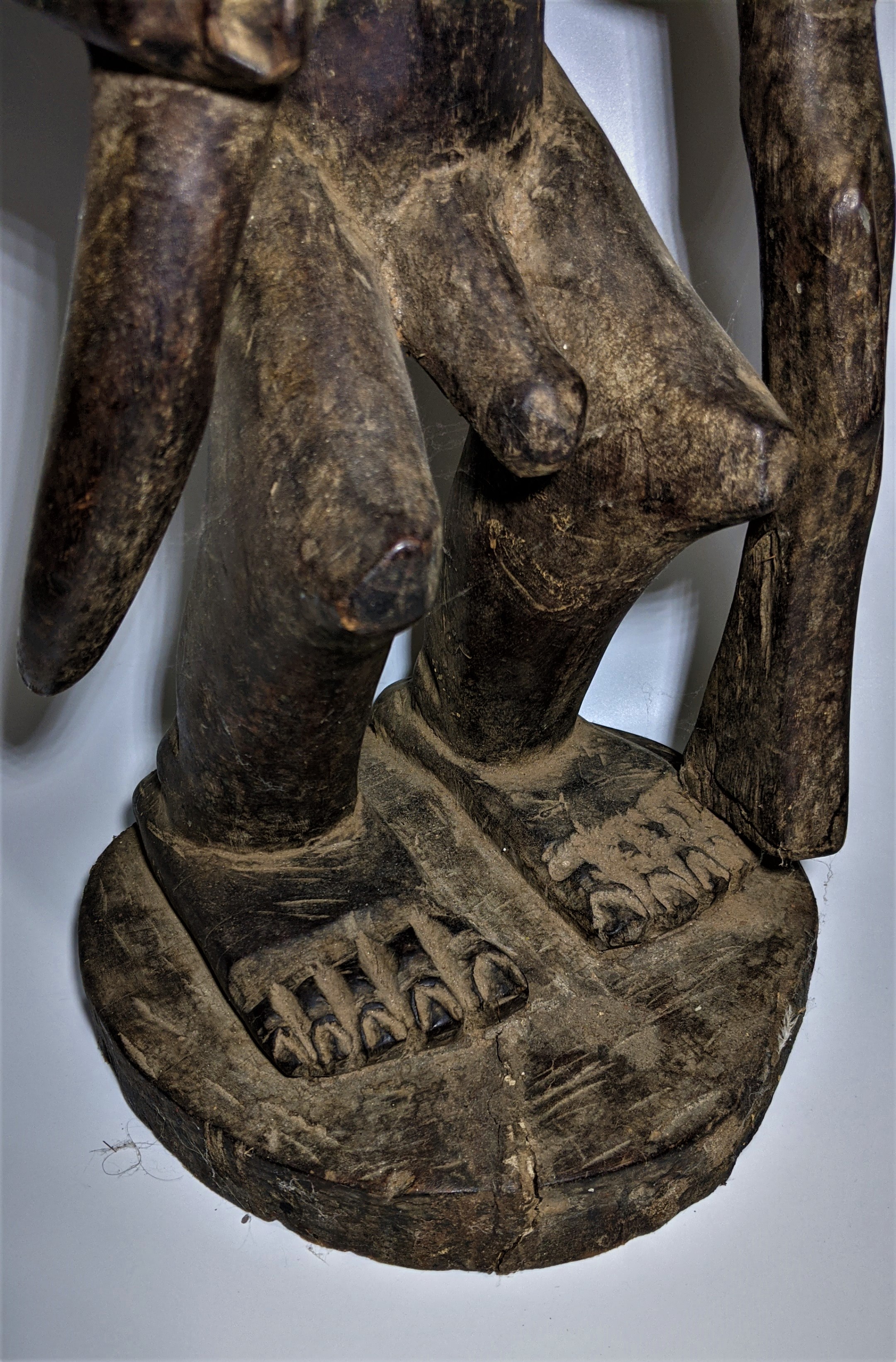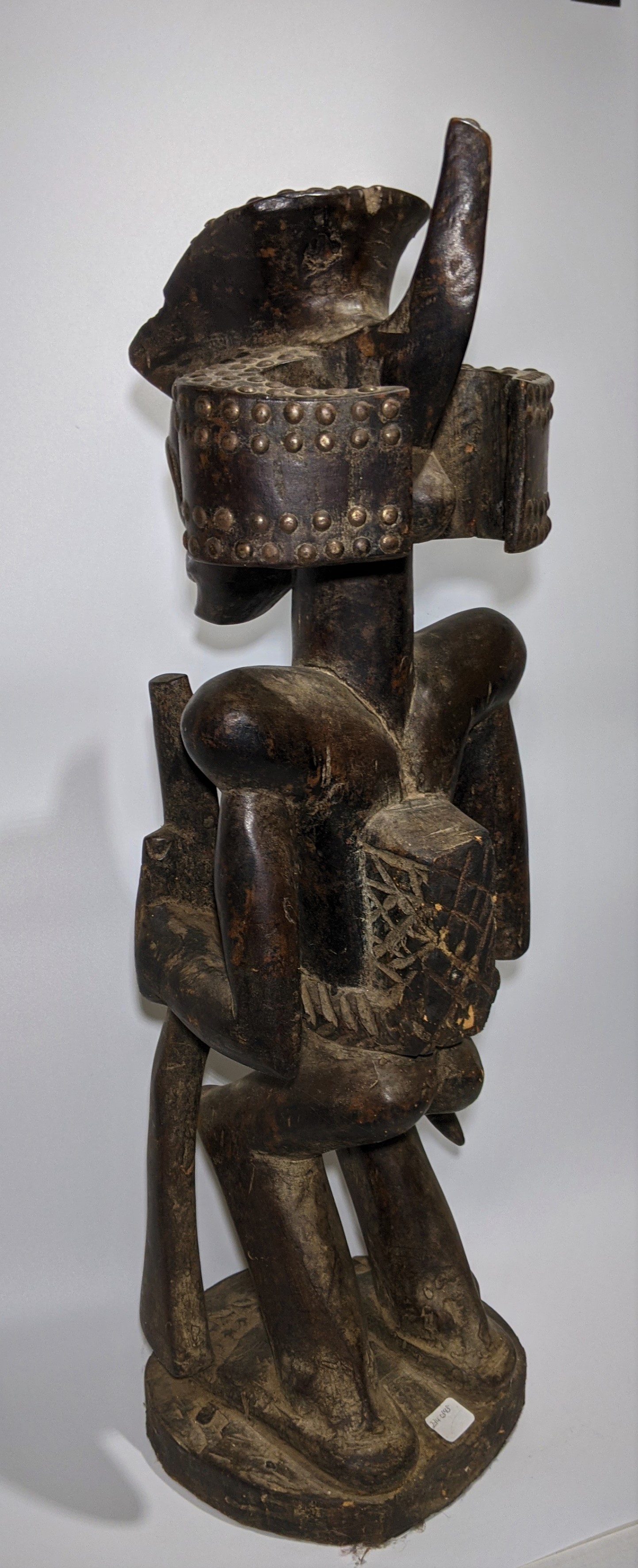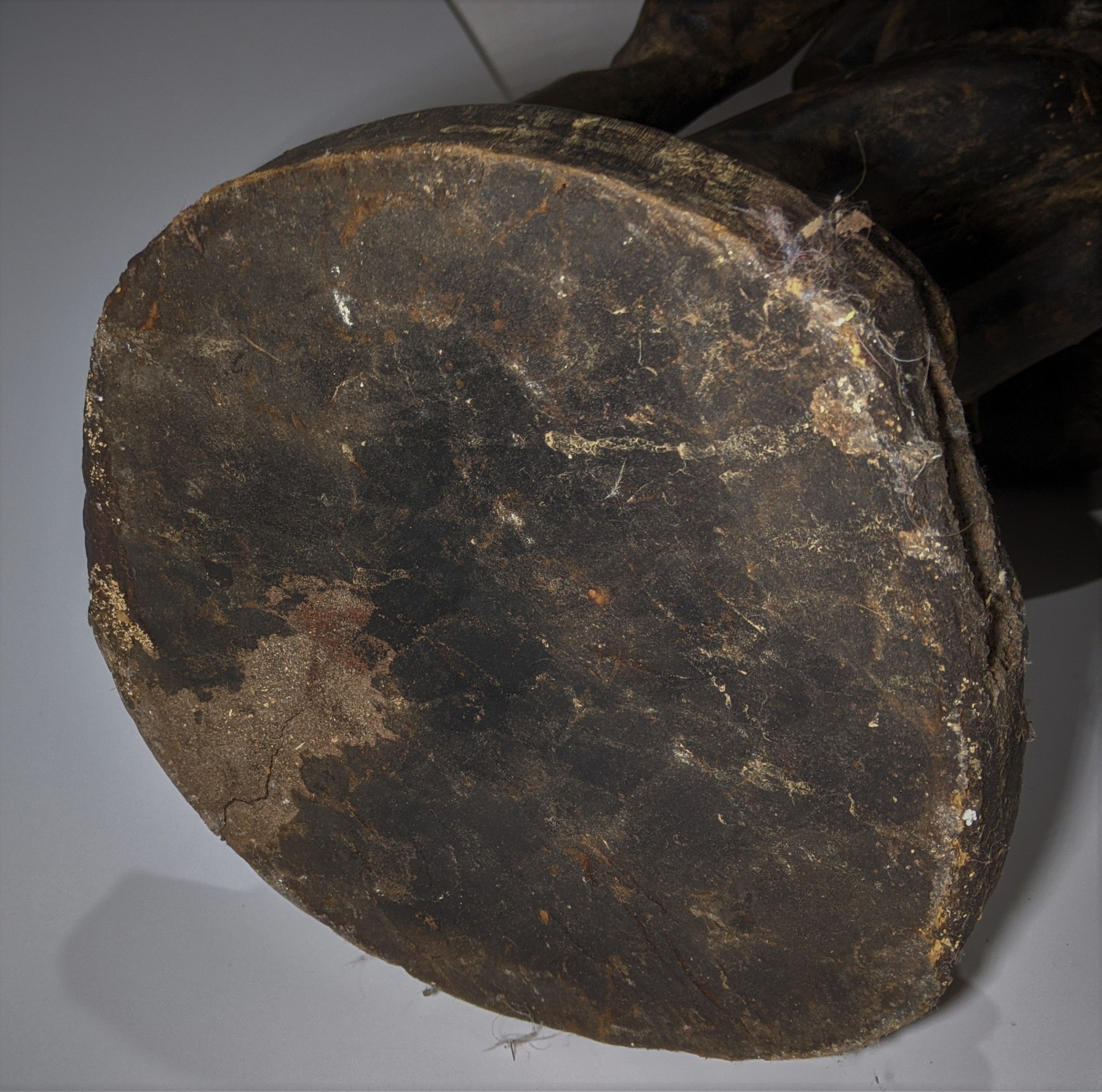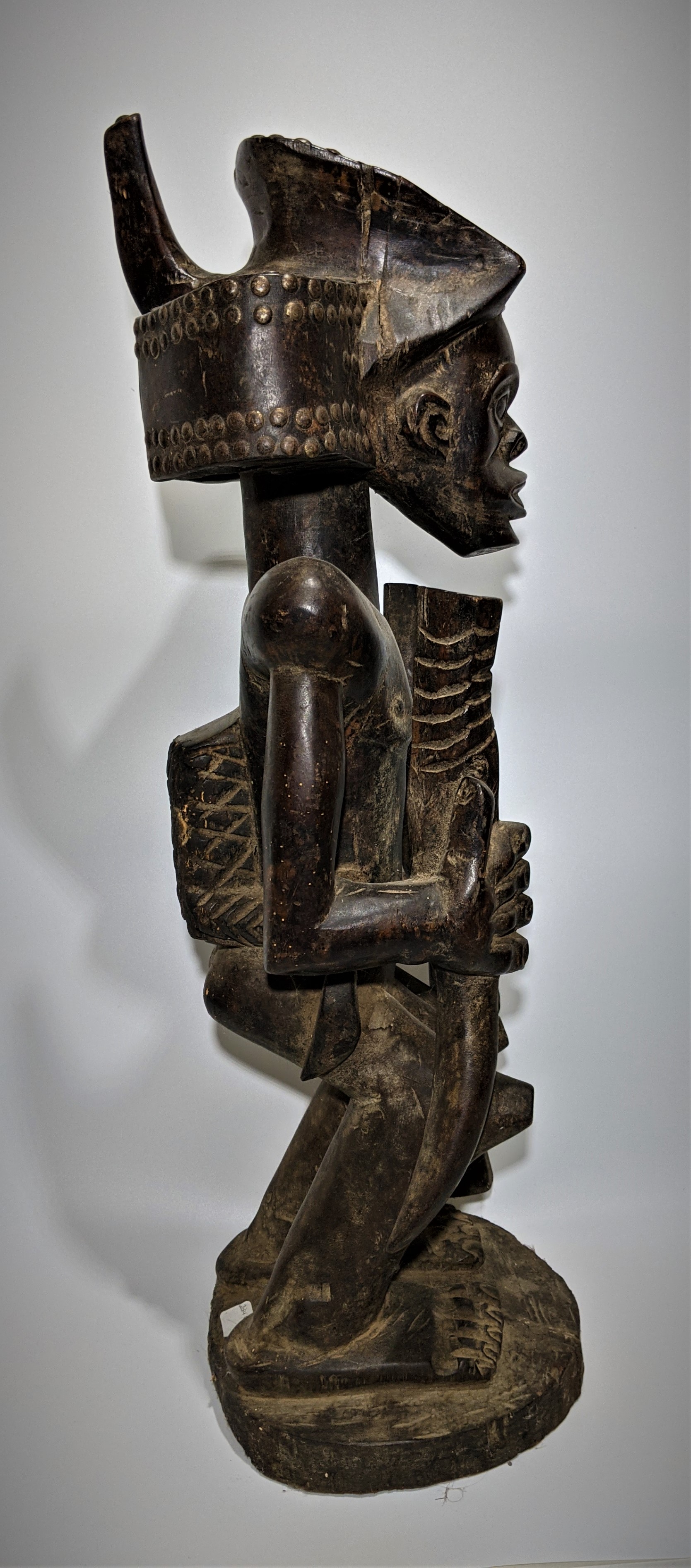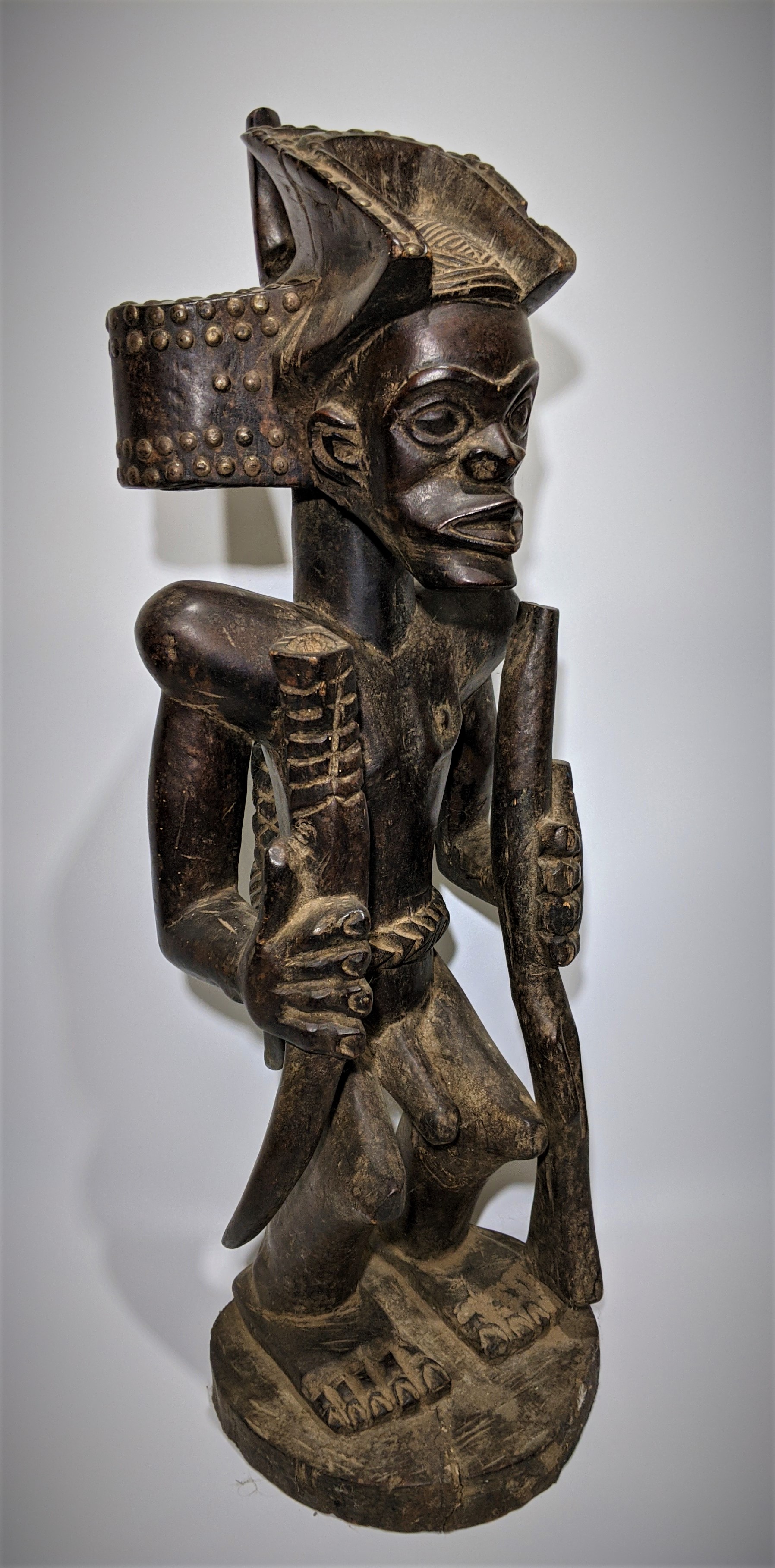 One of the 'pride of the museum', a classical rarity. A generous sized Chokwe warrior figure holding a flintlock long gun and horn in his massive hands. He stands with his high ranking helmet gear. Deep, dark and dense hardwood with a crisply carved face. 27.5" height.