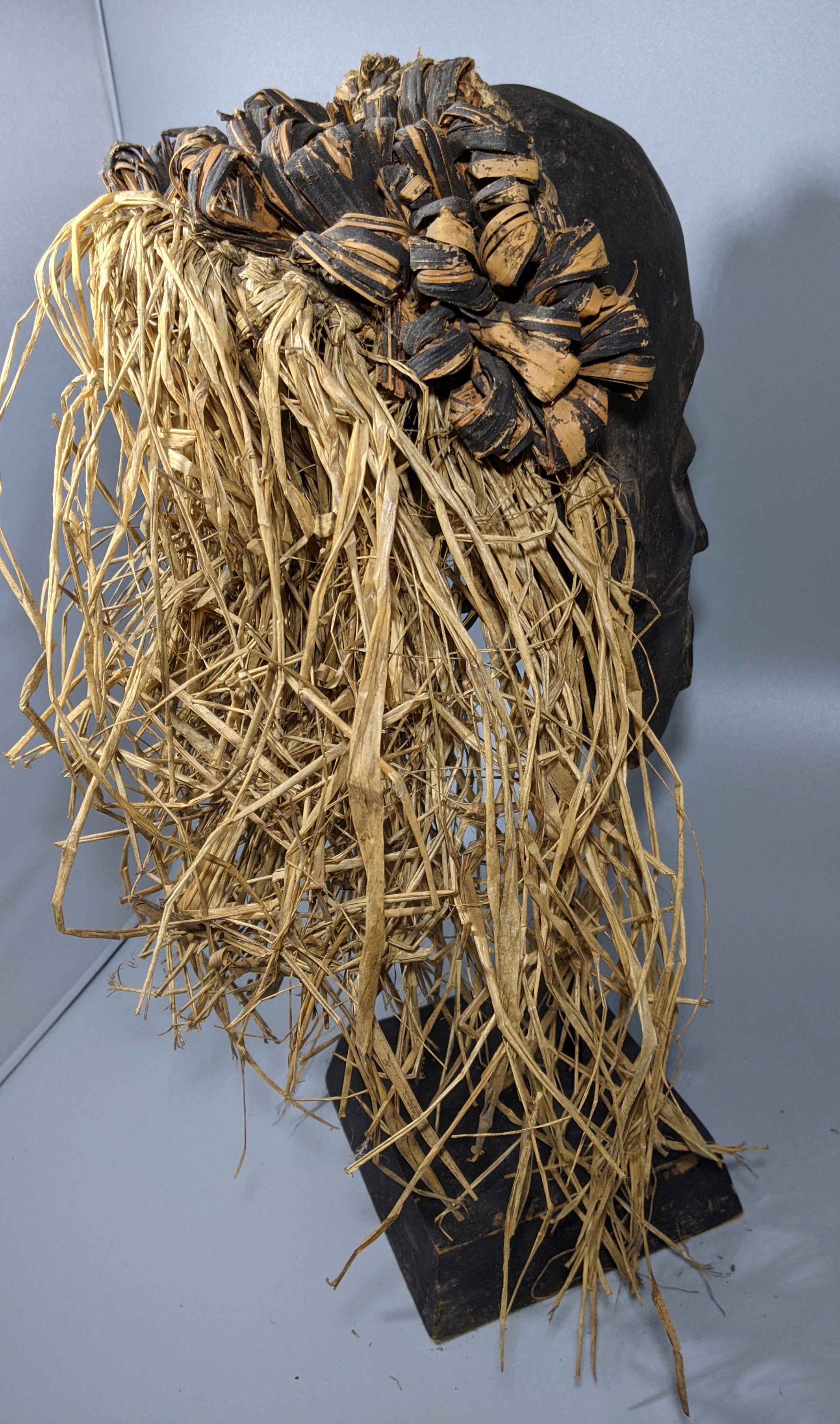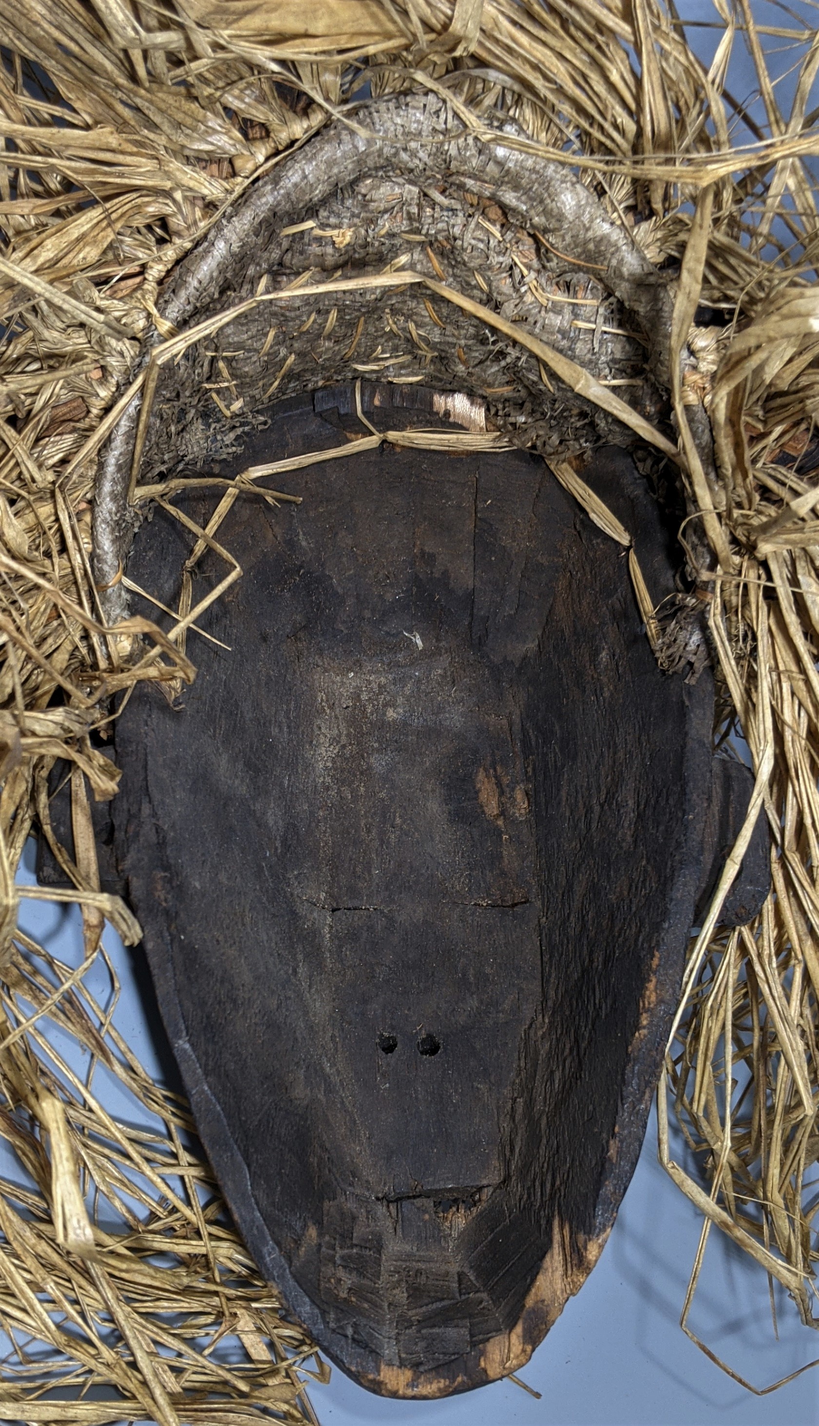 A classical tribal carving with strong age and likely more modern fiber work attachments. Dry natural and original surface. 11" Height.
