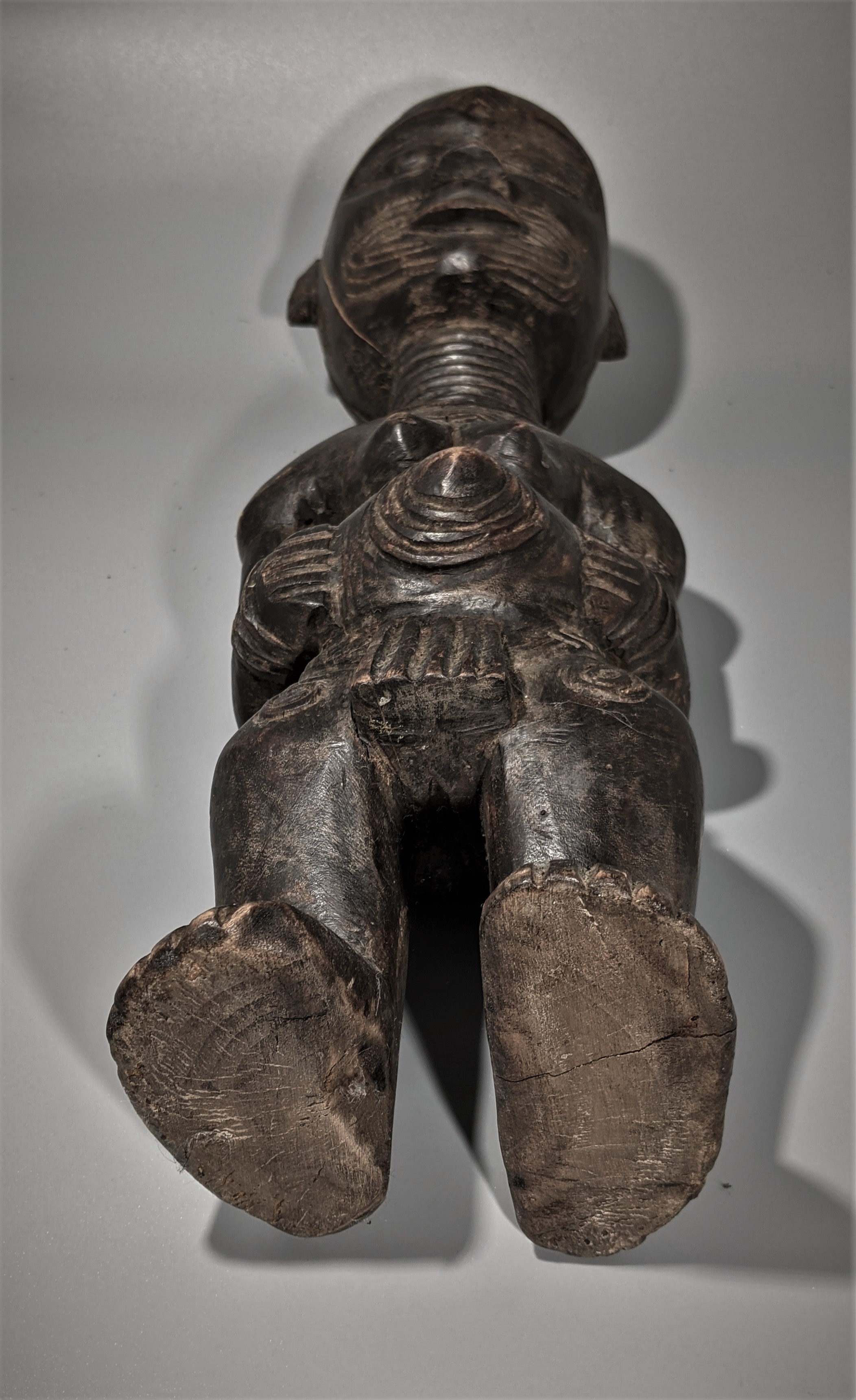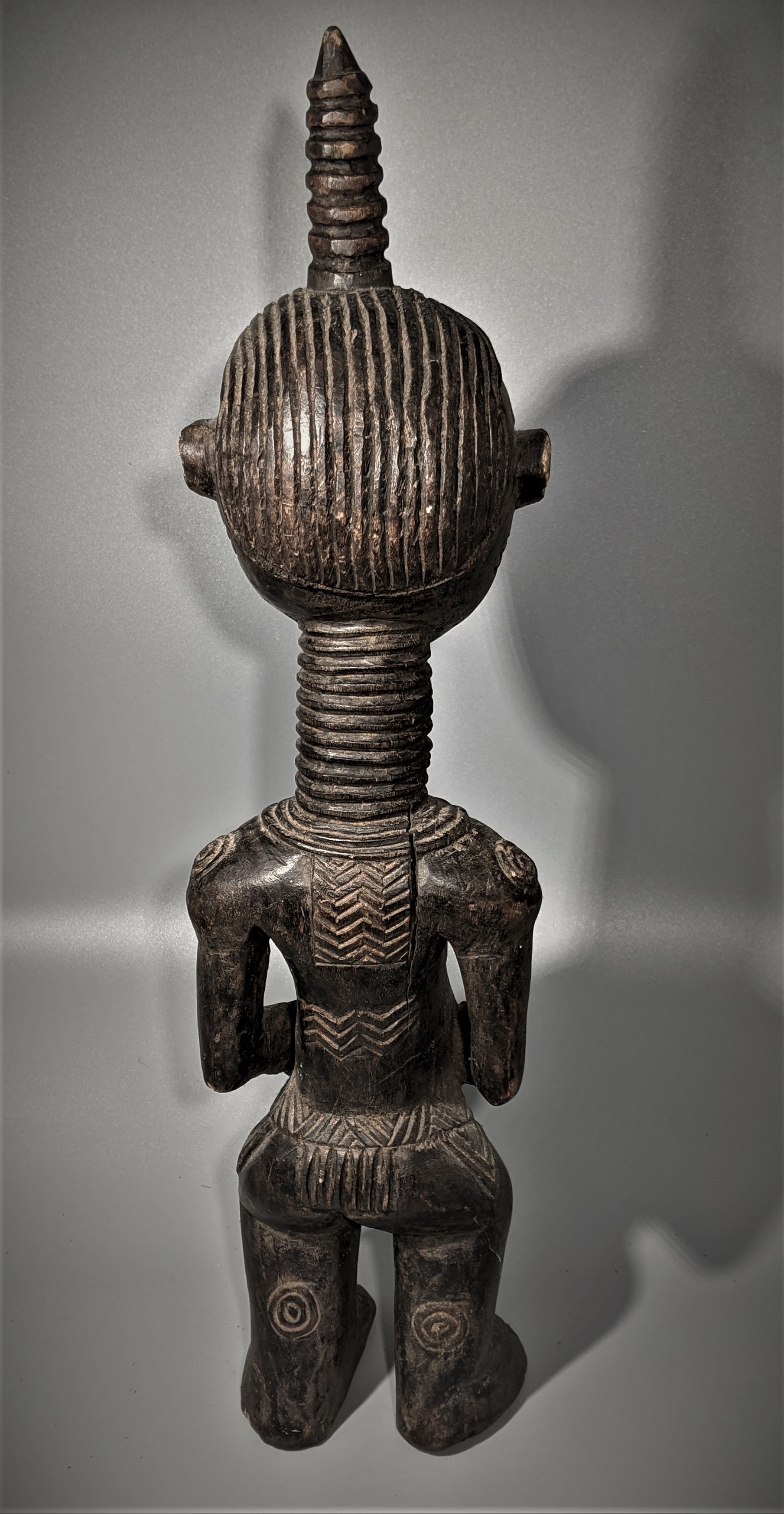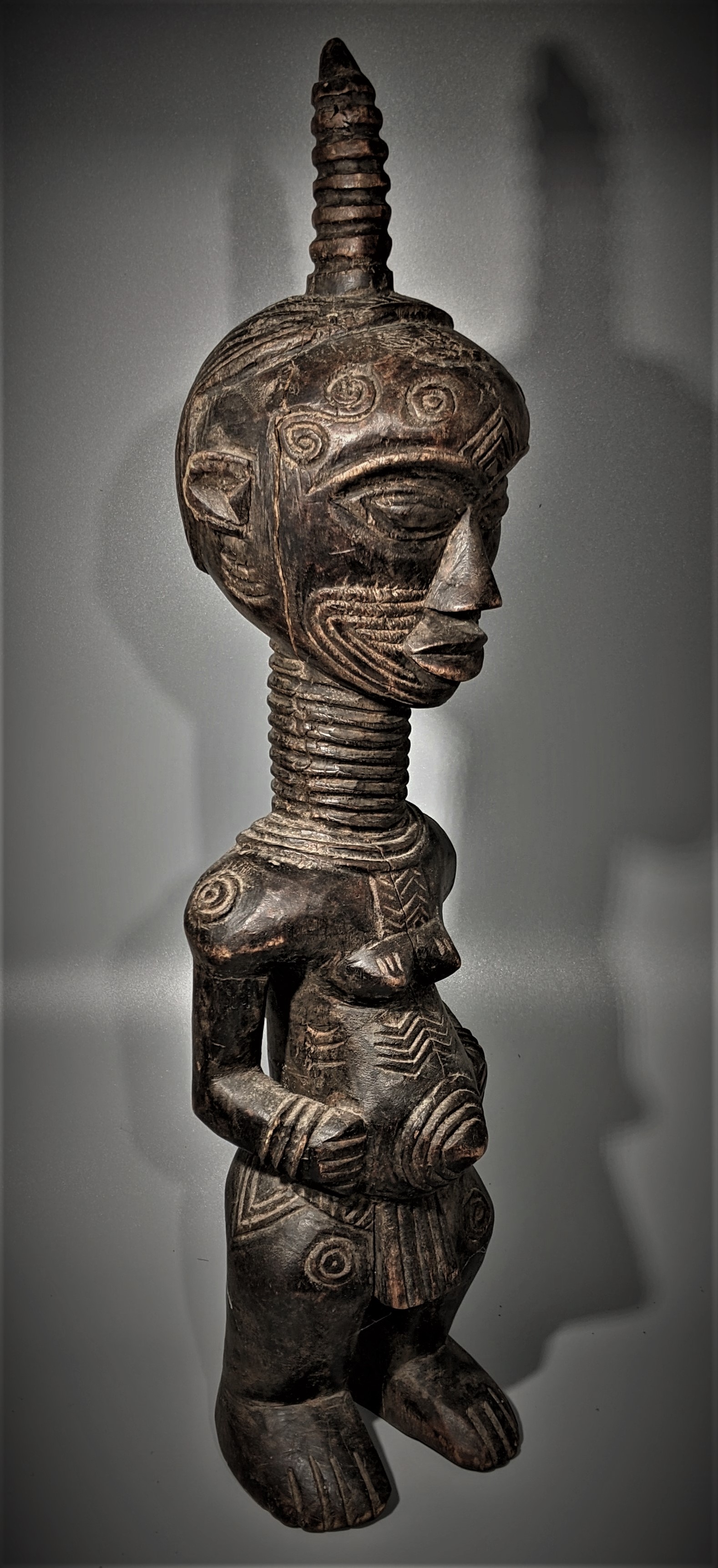 A good and well carved female example. Untouched old surface. Cracks front and rear and right side of the face. Turn of the last century. Uncommon larger size. 23" Height.