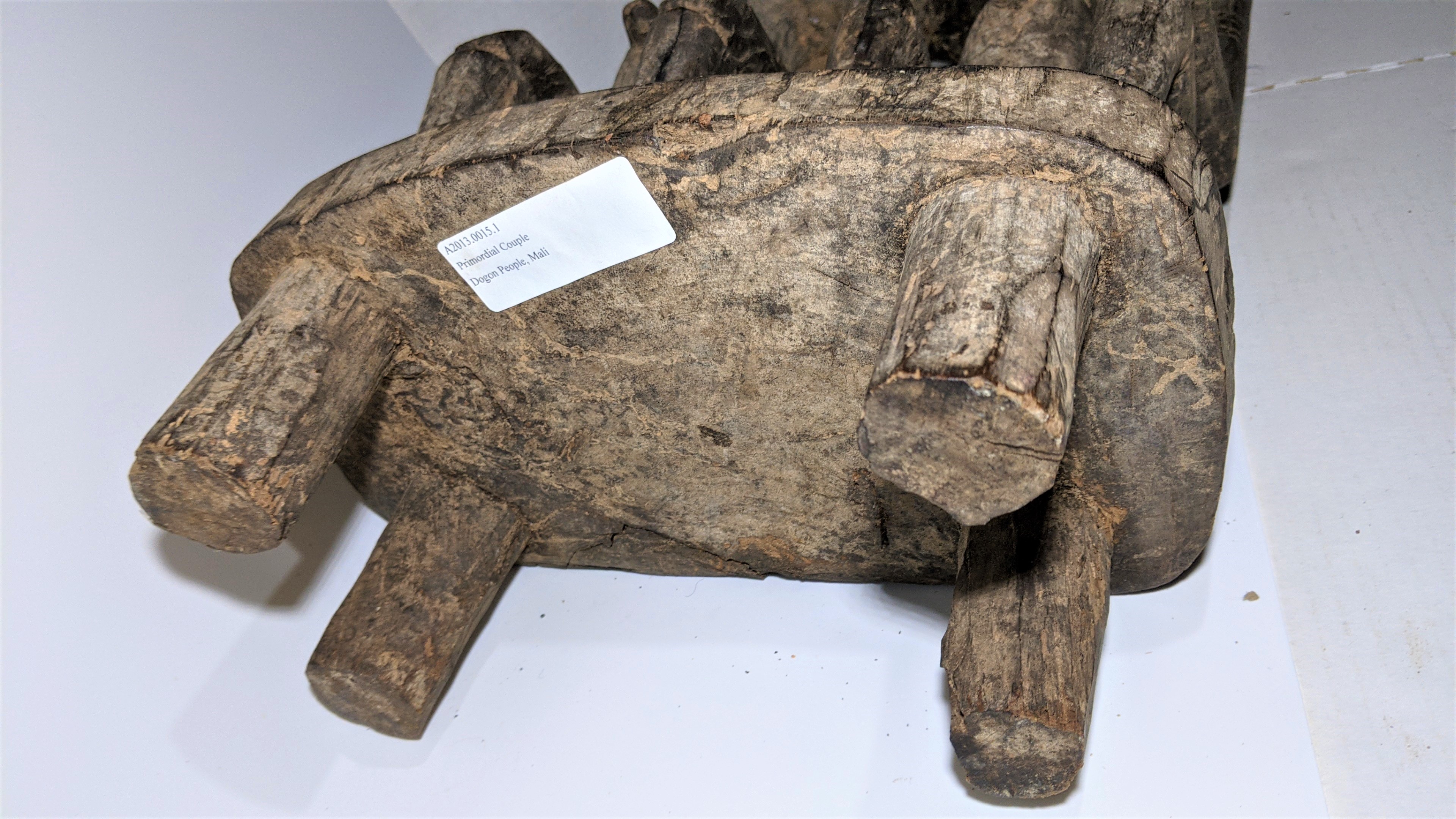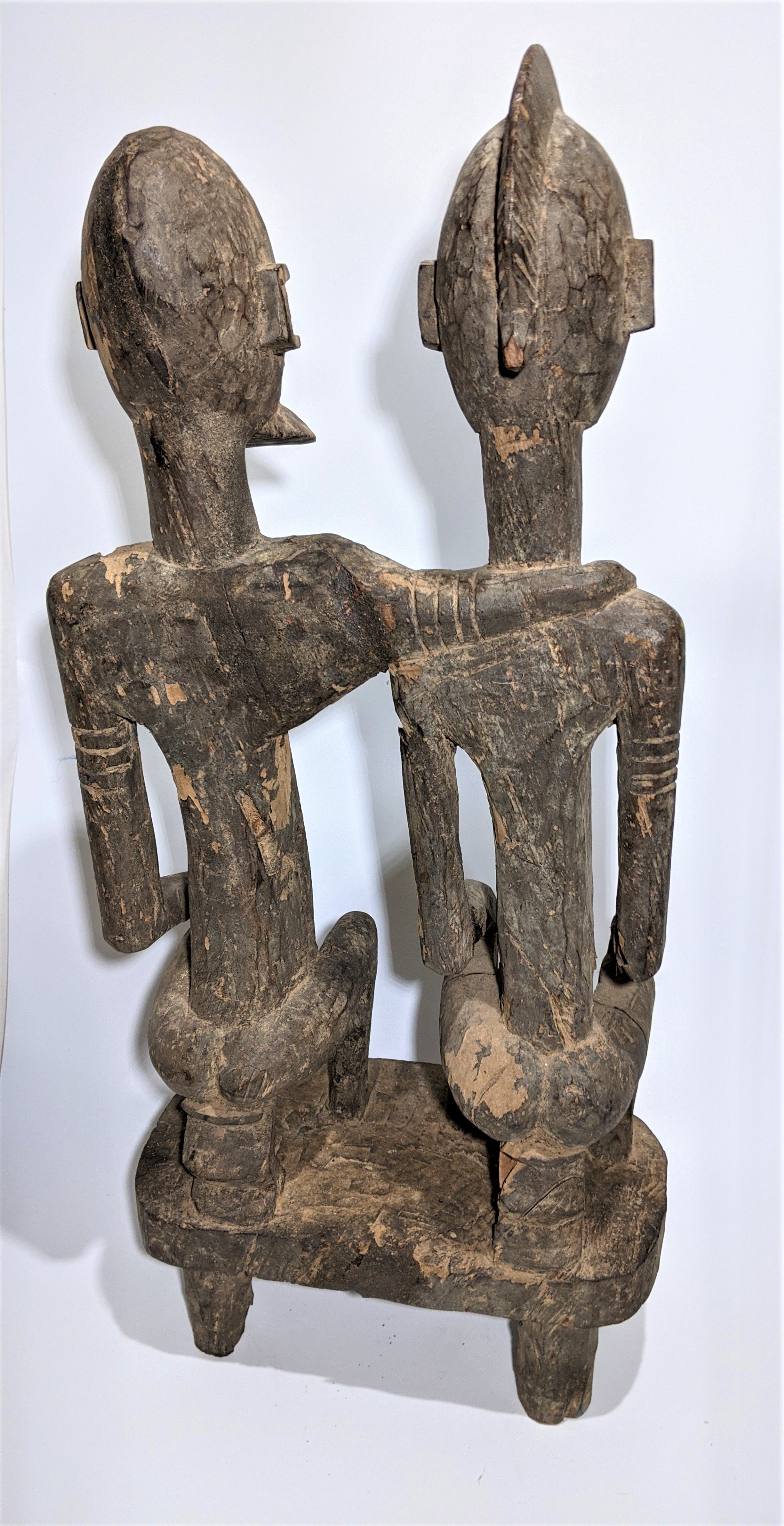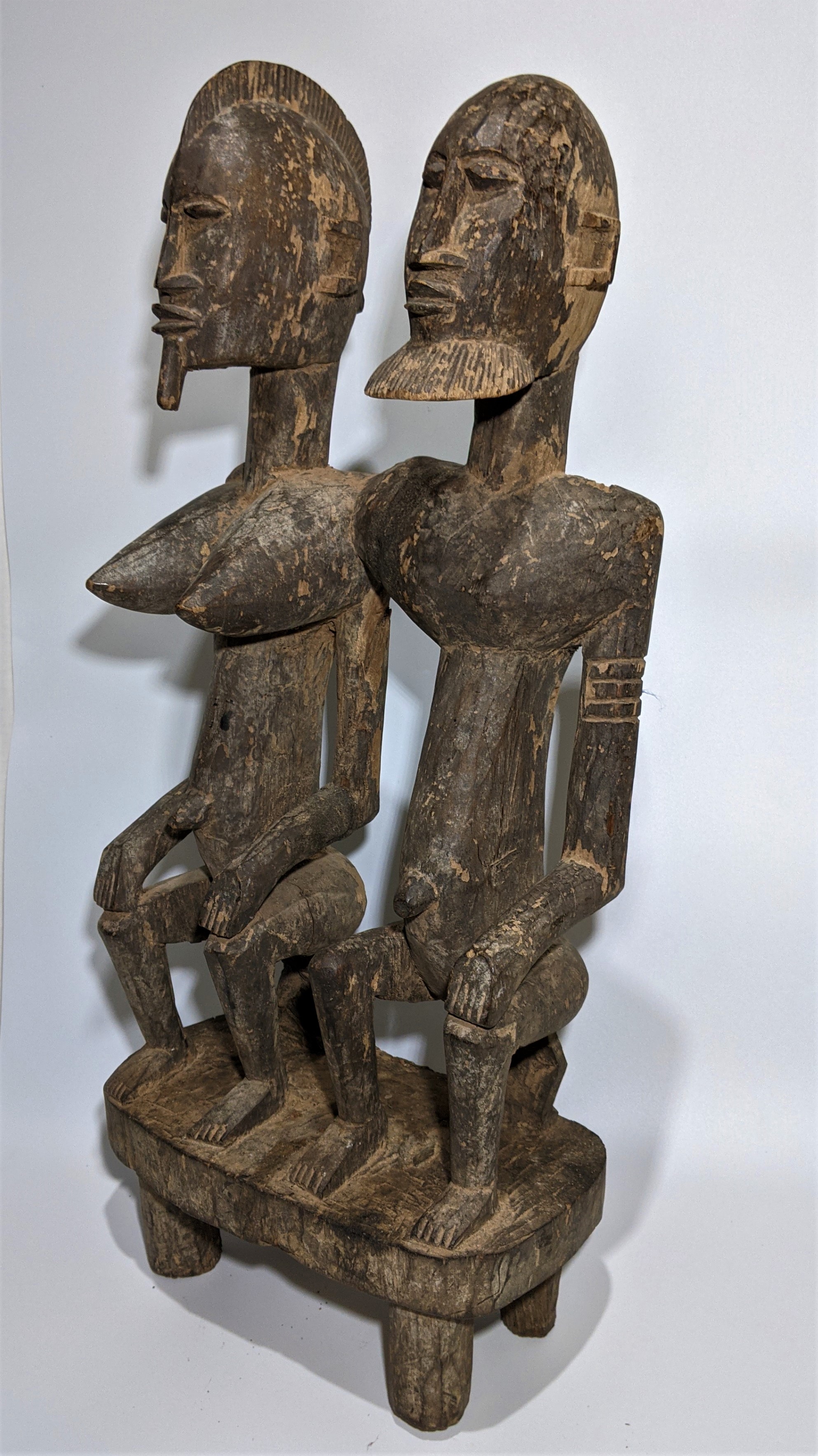 Legitimately ancient, an older and strong example of this type. Unusual, up on its integral four-legged stand. Natural deteriorations, mostly on the female at back. An extremely dense and knarled hardwood. From the central high plateau region of Mali. 25.5" Height, 12" Length.