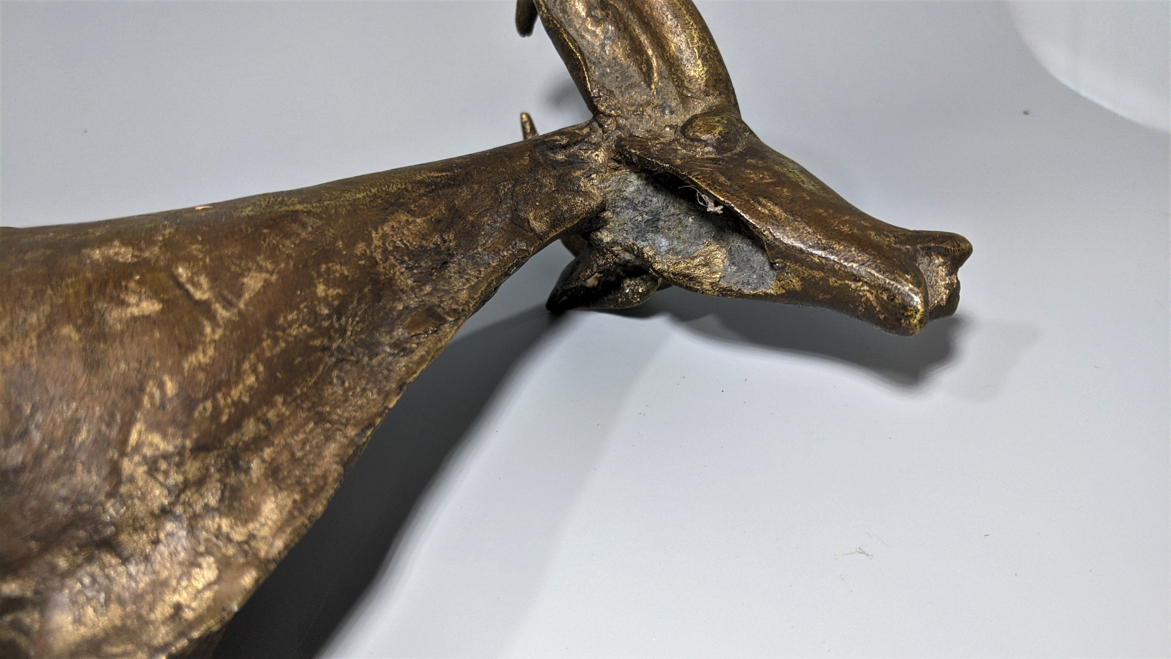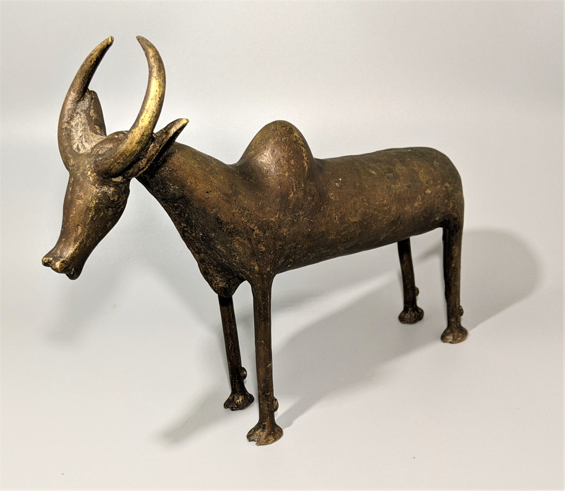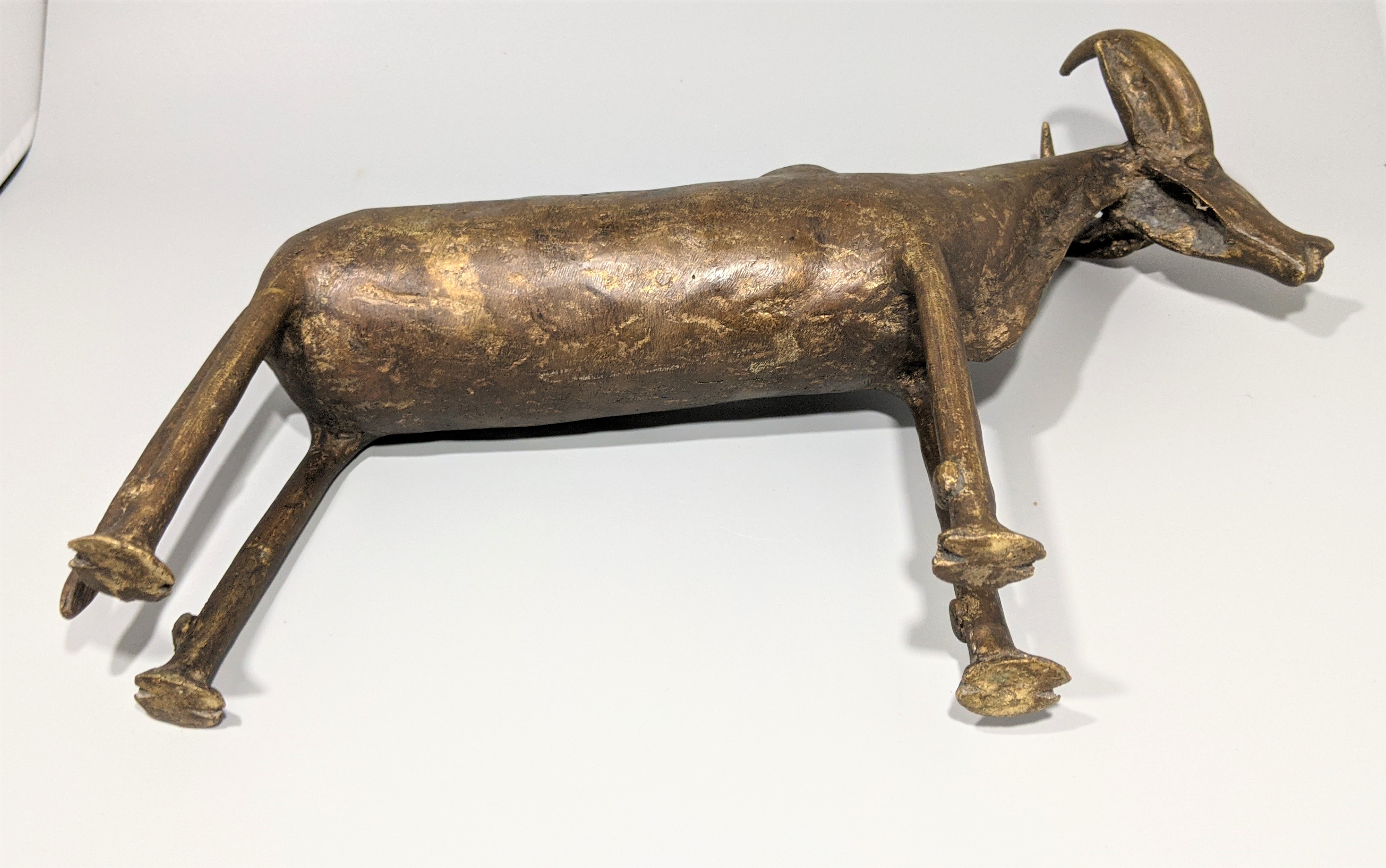 From the Cross-River region, an area separating Cameroon and Nigeria. Old, likely 18th or 19thcentury. Natural untouched surface. A bronze with high brass content. Exceptional size, solid cast. 11.5" height, 15" length. Ex-Museum, Mass.