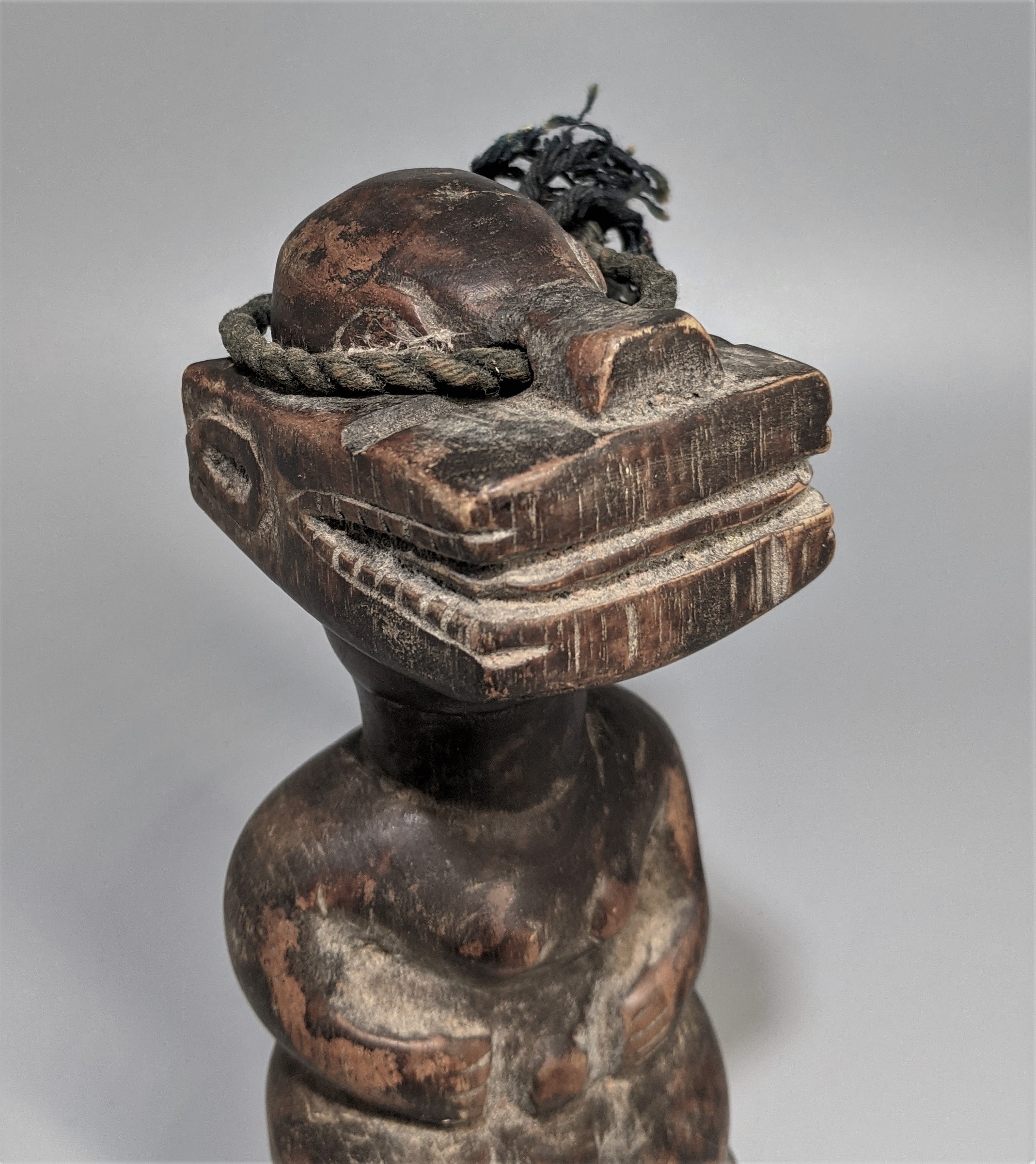 An early male figure with crocodile head. The museum has it labeled as Senufo. Rich old unclean patina, well worn from use. 7 inches high.